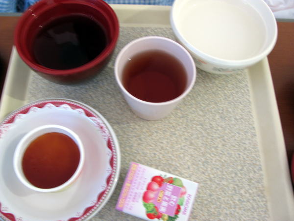 米粒が無い重湯、具の無い吸い物、多分プリン、野菜ジュースにお茶。