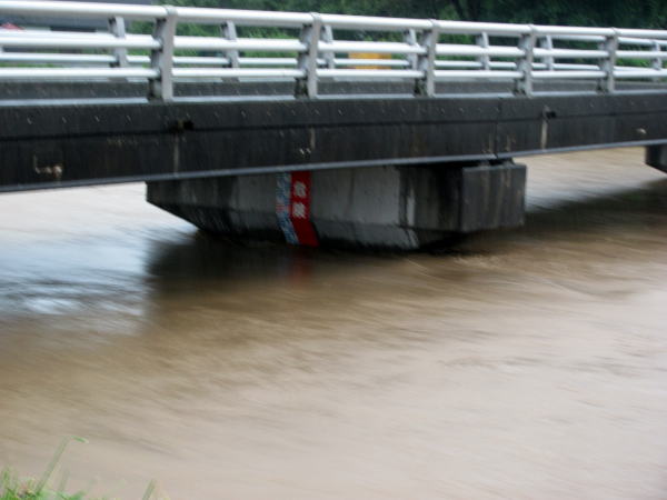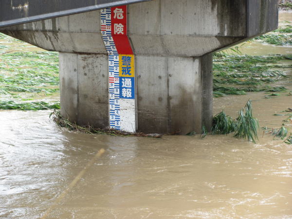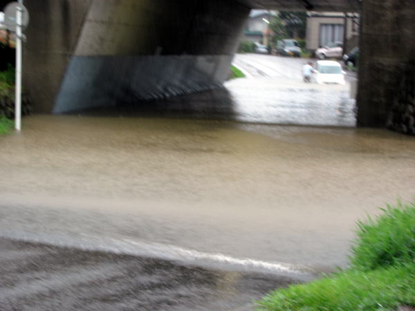 外へ出てみると道路は冠水し上の写真のように車が突っ込んでいるし、川の水位も危険水位に達している。